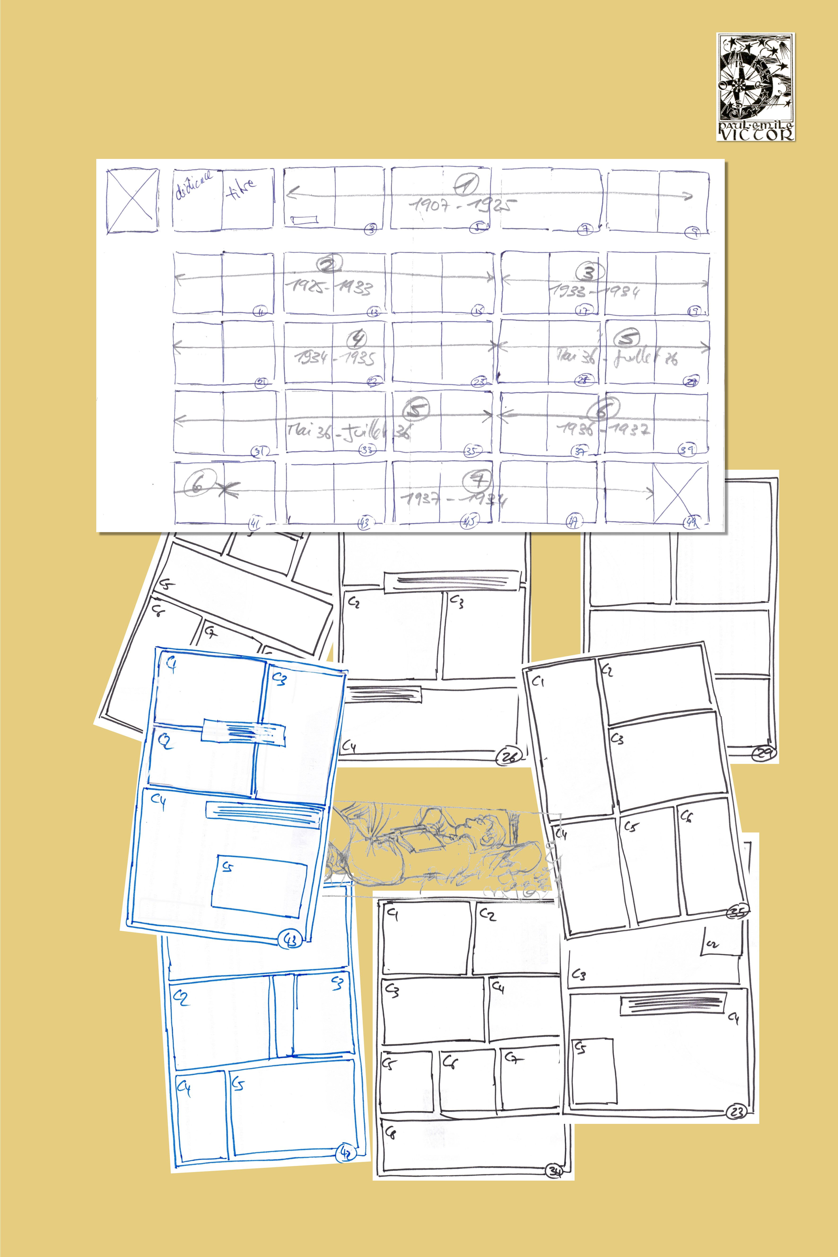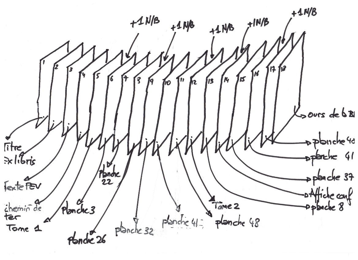 Il s'agit pour le scénariste de la représentation du contenu chronologique de l'album, avec une vision globale des 48 pages. Cette représentation schématique permet de visualiser le découpage des scènes, les changements narratifs, la mise en place de raccord temporel, soit tout ce qui concourt à la meilleure organisation de l'album. A partir de ce chemin de fer, le scénariste découpe les pages ("les planches") en un certain nombre de cases. Une pleine planche comporte une seule case. La planche 34 est composée de 8 cases.