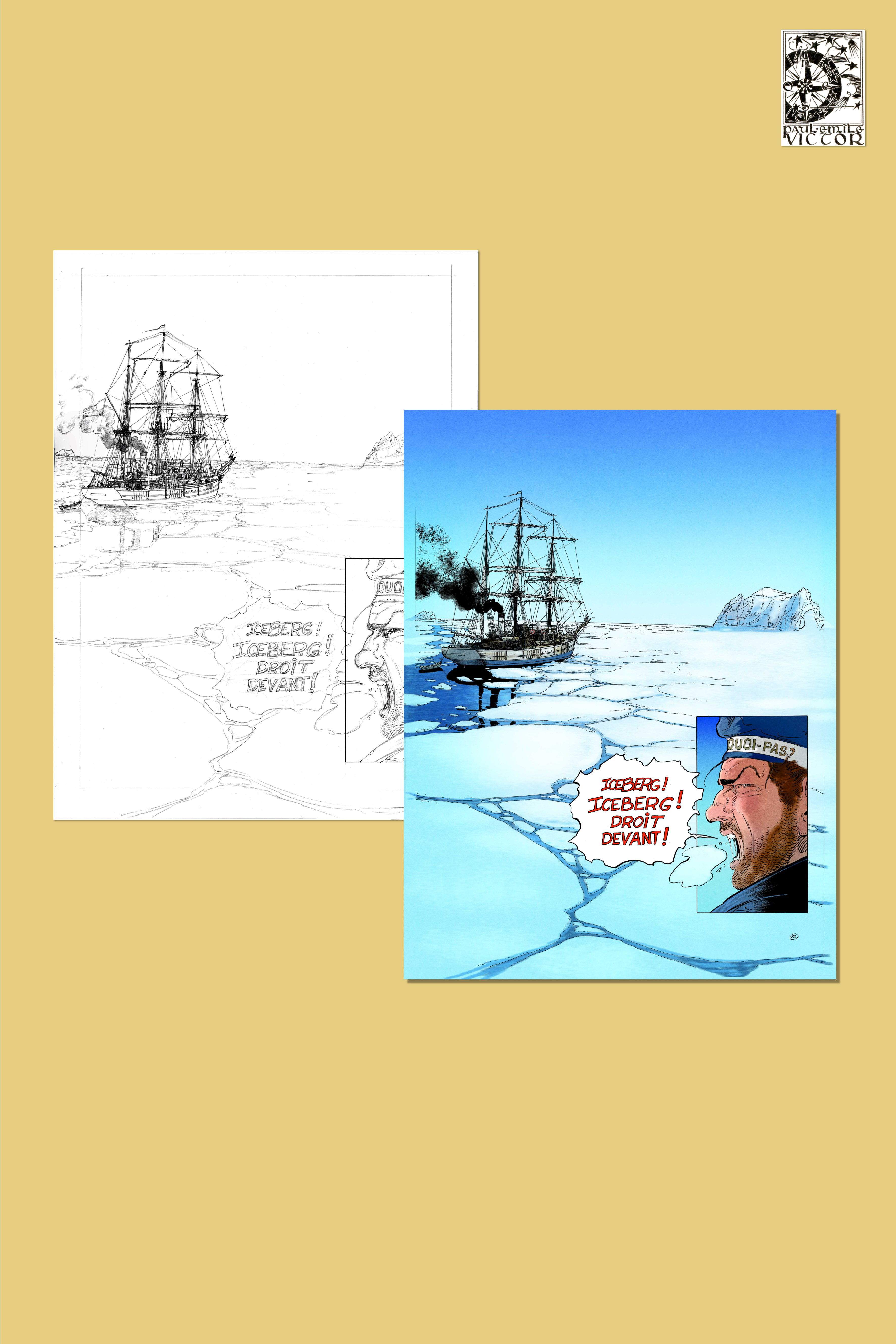 "Ce matin-là, quelque chose avait changé soudain dans la brume légère. Je sais aujourd'hui qu'il s'agit d'une odeur, celle de la glace proche. C'est le Pacha qui nous le dit : "Les glaces ne sont pas loin". Dans l'après-midi, le premier glaçon apparut sur l'avant. Un glaçon. Pas un iceberg. Tout le monde était sur le pont à regarder ce minuscule morceau torturé par la fonte, ce qu'on appelle dans le jargon français correspondant : un cygne ou un bourguignon. Et puis, là-bas, là où l'horizon aurait dû être, la brume était plus blanche, plus brillante. Avec l'autorisation de Charcot, j'étais monté dans le nid-de-pie. Je n'ai pas de honte à l'avouer, mon cœur se mit à battre très fort lorsque, pour la première fois, j'aperçus la banquise, la vraie".