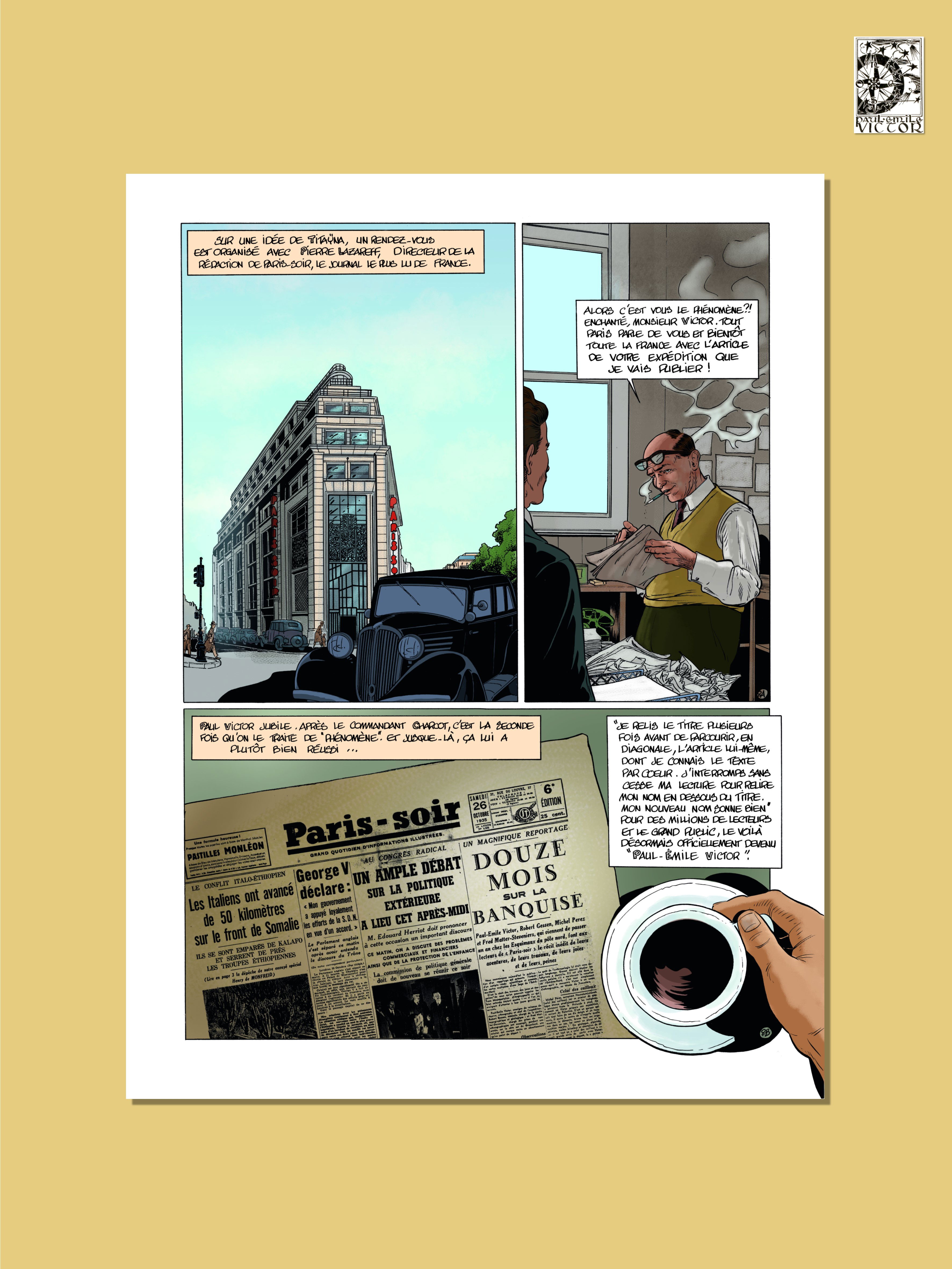 C'est avec la planche 8 que nous découvrons le journaliste et patron de presse Pierre Lazareff. Il a du flair et reconnaît immédiatement le bon filon de l'expédition de PEV. Il va véritablement faire de l'explorateur un personnage public.
