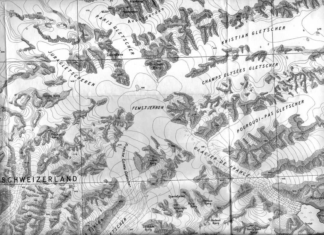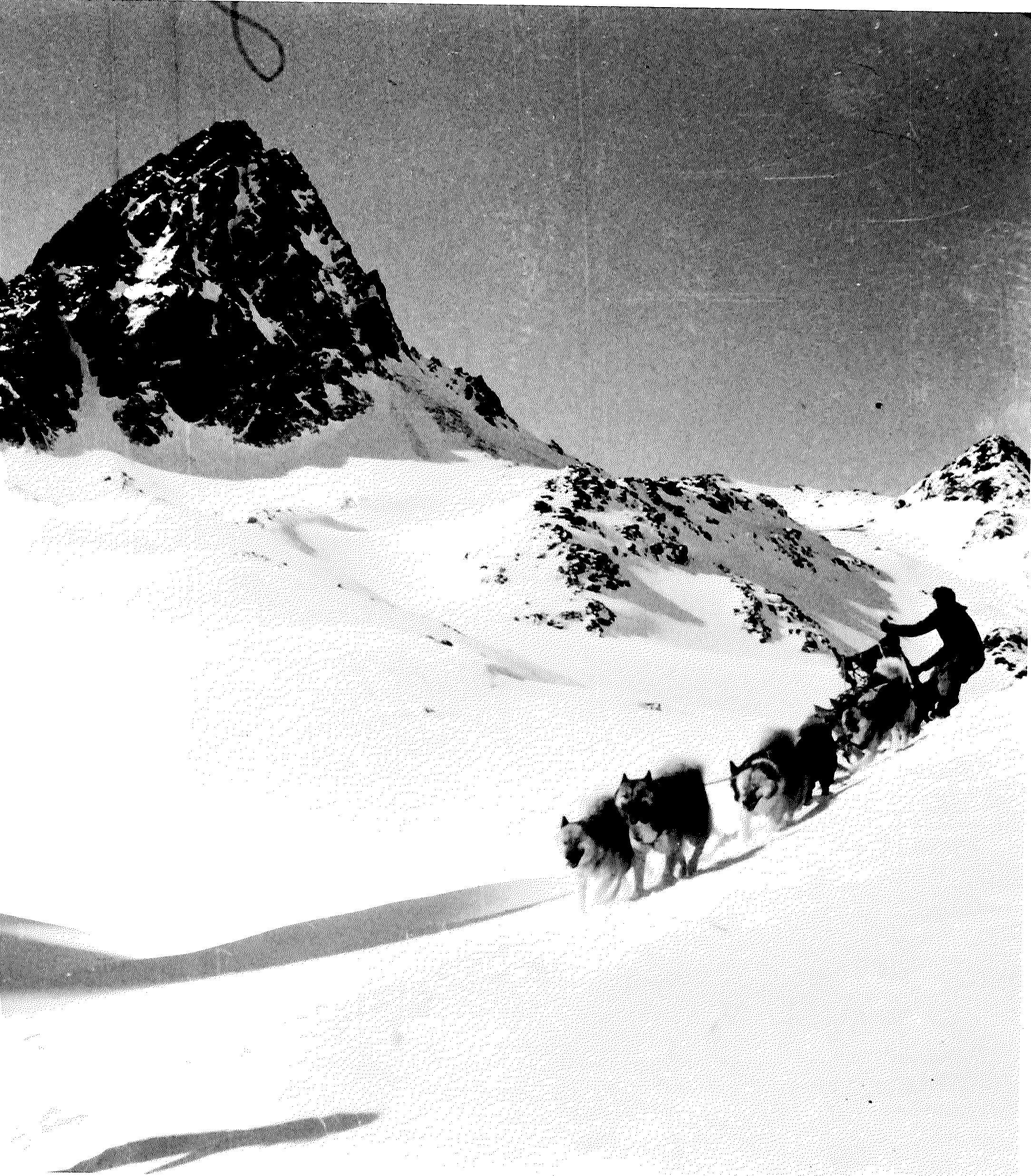 Debout sur nos traîneaux, nous ne sommes plus que des yeux qui scrutent les moindres coins de neige pour y découvrir la tache jaunâtre qui pourrait être un ours. Après un passage impressionnant sous une falaise, où les traîneaux avancent avec peine et bondissent de gauche à droite, dans un enchevêtrement de glaces et d'icebergs, nous débouchons enfin sur une surface plate et lisse qui s'étend devant cet immense glacier appelé par les esquimaux "iguertewa" (celui qui est large), et qui sur les cartes danoises est nommé : Steenstruo Braer."